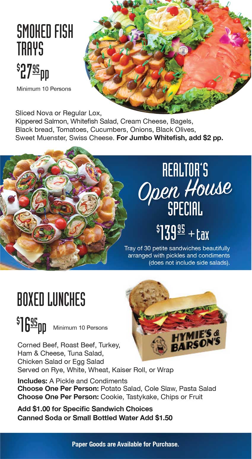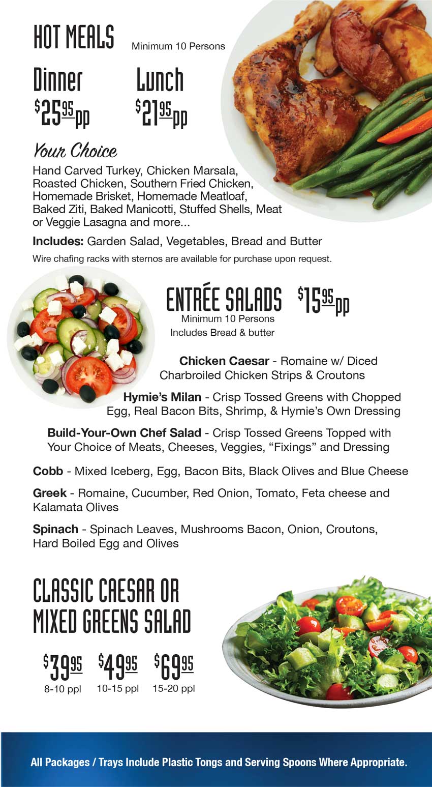 Take a look at our menus. Whether you are eating at HYMIE'S DELI, Enjoying a CATERED MEAL. We think you'll be tempted to CONTACT US.