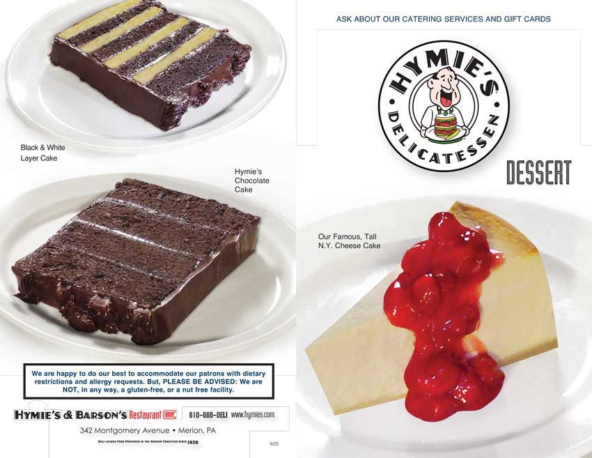 Hymie's Deli Classic Desserts, feature a selection of traditional deli desserts that are sure to delight your taste buds. From rich and indulgent Jewish Apple Cake to fluffy and moist chocolate cake, our desserts are made with love and care, just like Bubbe used to make. Treat yourself to a sweet slice of history with Hymie's Deli desserts, perfect for any occasion or just because. Enjoy a taste of tradition with Hymie's. Indulge in the flavors of Hymie's and experience the true taste of Deli heritage. Order now and treat yourself to a slice of heaven!