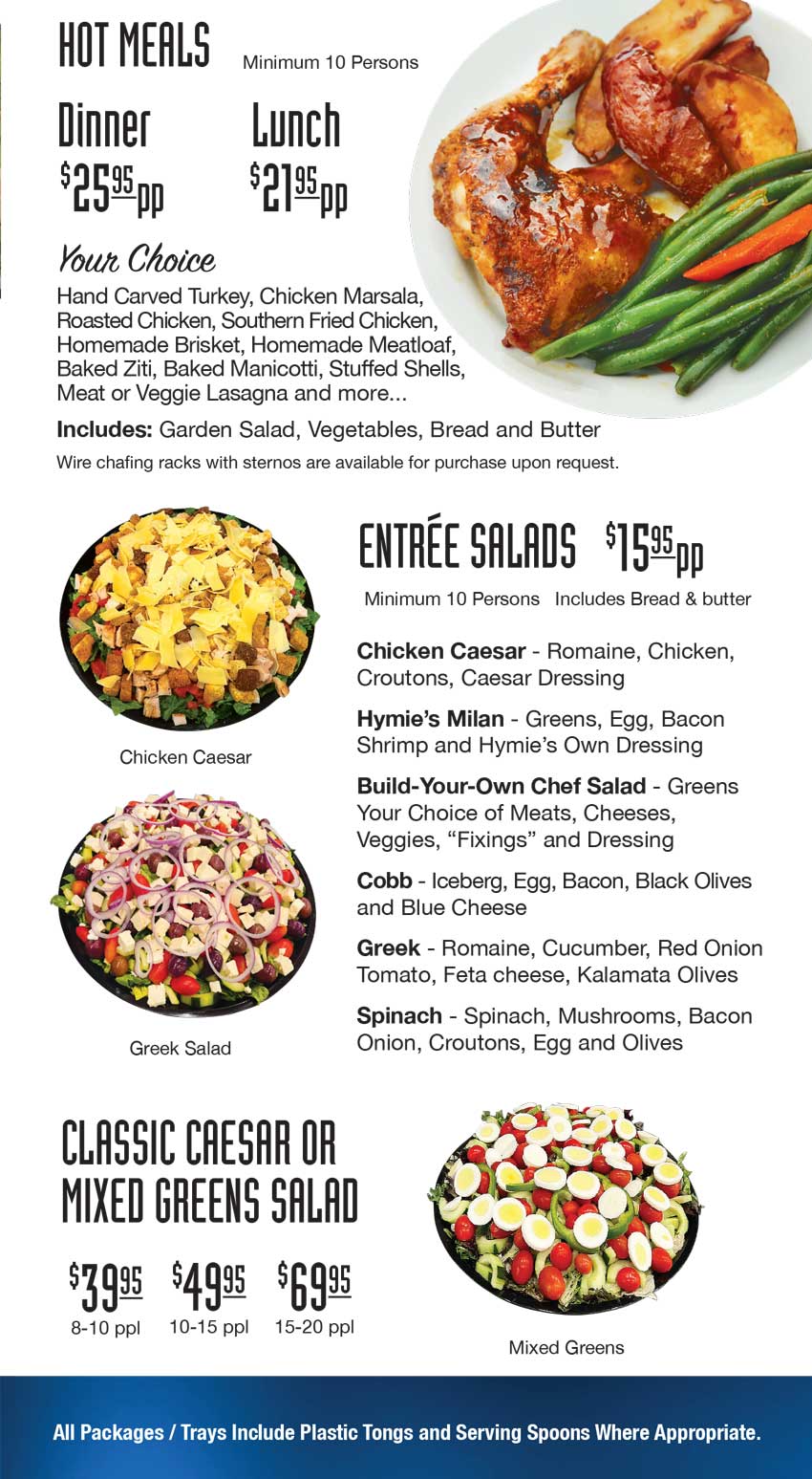 Take a look at our menus. Whether you are eating at HYMIE'S DELI, Enjoying a CATERED MEAL. We think you'll be tempted to CONTACT US.